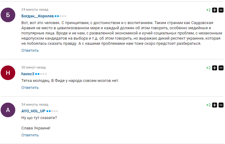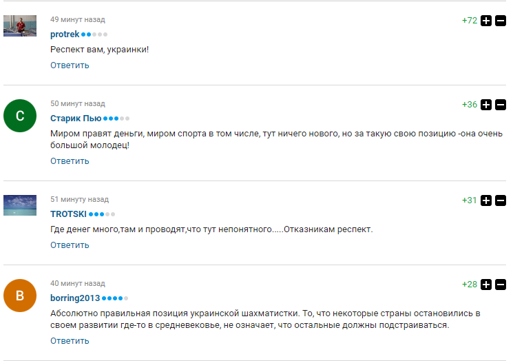 Решение украинской шахматистки Анны Музычук бойкотировать чемпионат по шахматам в Саудовской Аравии вызвало фурор у российских болельщиков. В комментариях на страницах одного из самых известных спортивных изданий РФ фанаты восхищаются поступки львовянки и признают ее мужество.